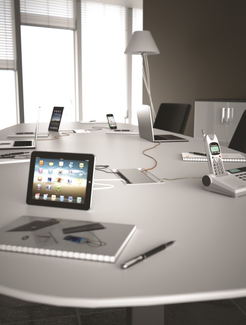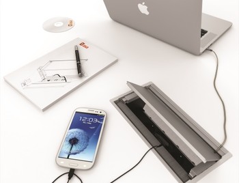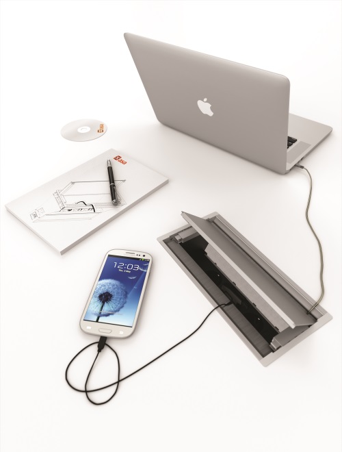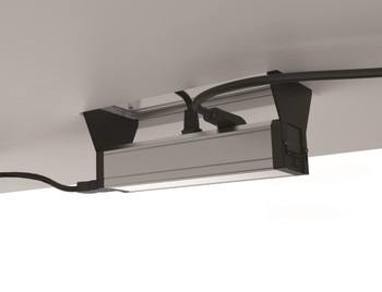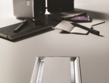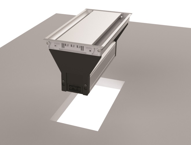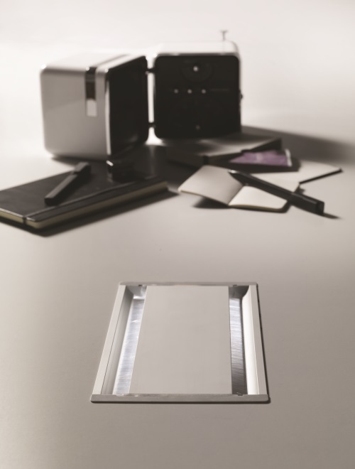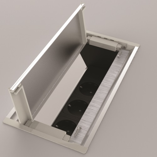 Встраиваемый в столешницу розеточный блок с поднимаемой в две стороны крышкой и щеточными вводами для проводов. - 06012F00006