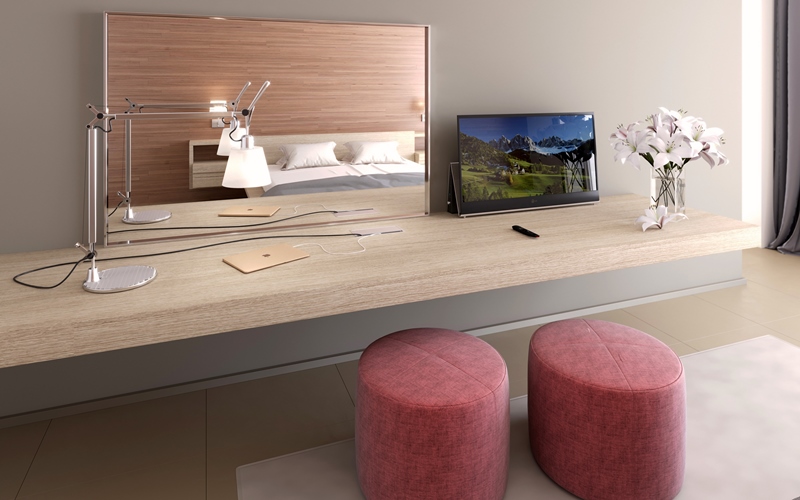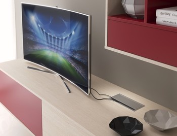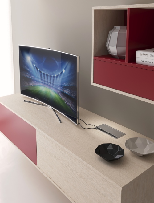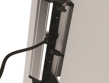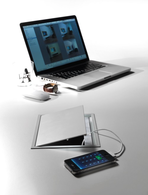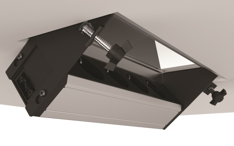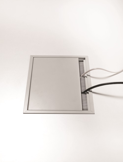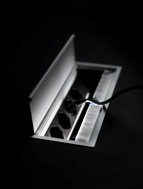 Встраиваемый в столешницу розеточный блок с поднимаемой крышкой и щеточным вводом проводов.