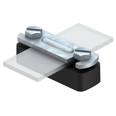 • для плоских проводников FL 30; • с монтажным отверстием 6,2 x 22 мм; • с 2 цилиндрическими болтами M6 x 16 и перемычкой из стали горячего цинкования; • основание из полиамида черного цвета.