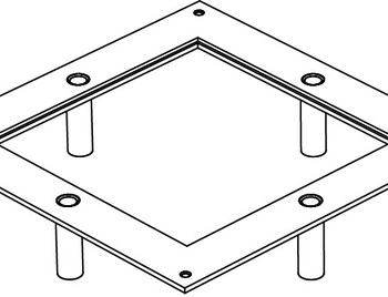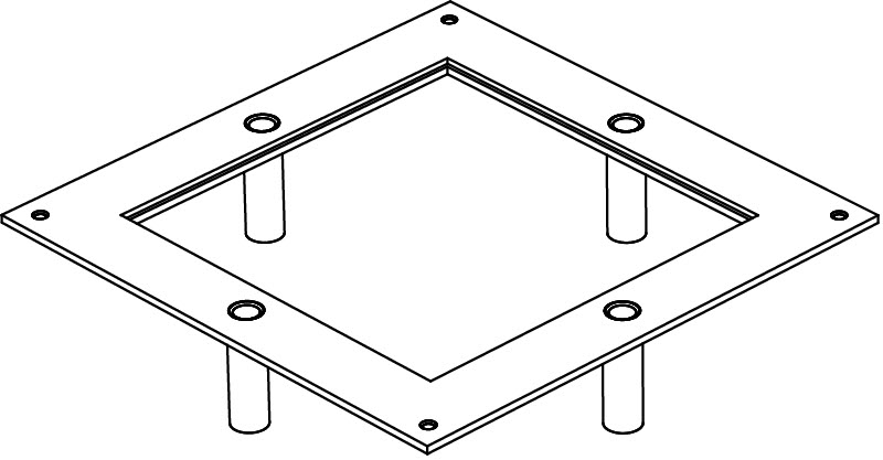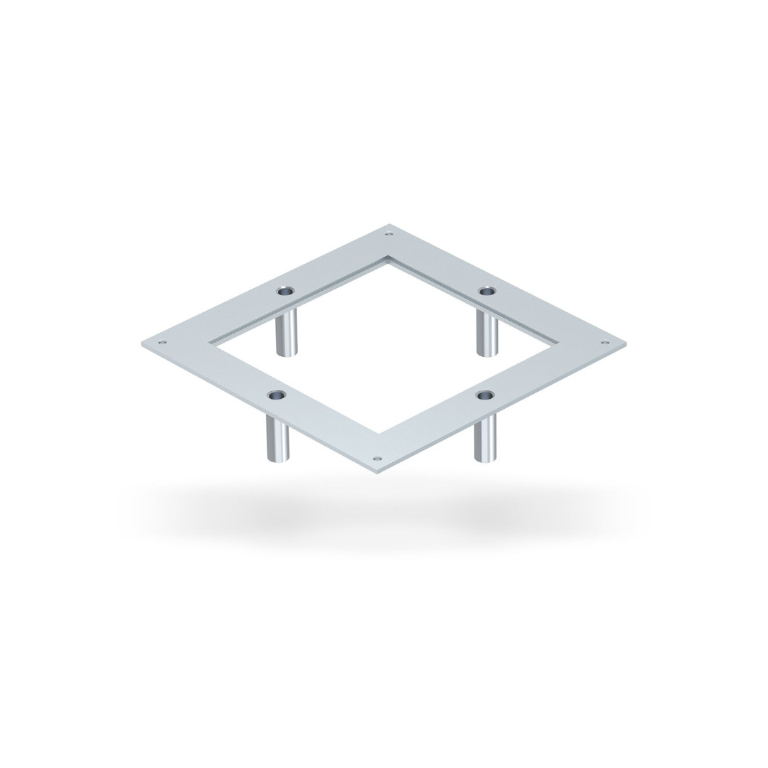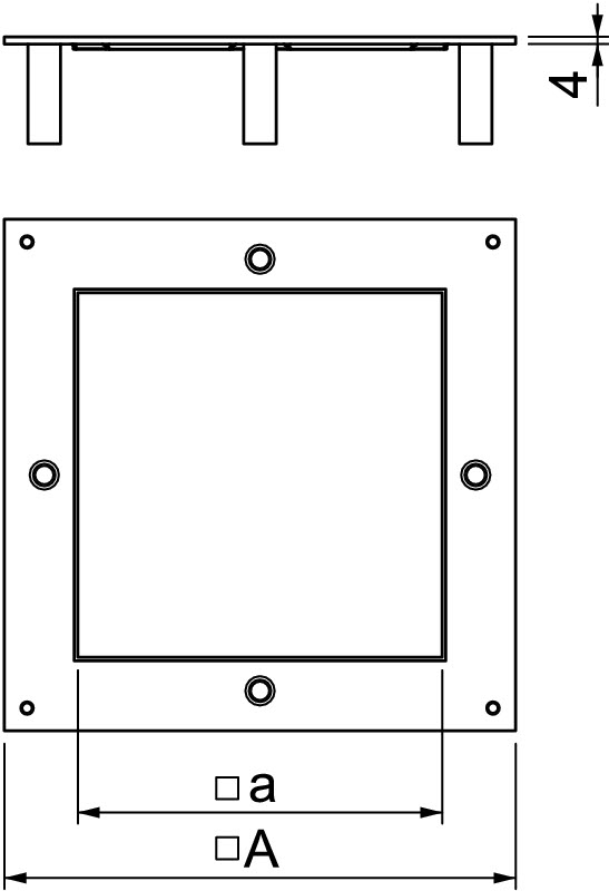 Усиленная крышка для монтажных оснований UZD250-3, с отверстием для установки усиленных кассетных рамок квадратной формы номинального размера 4. С четырьмя регулируемыми усиленными опорами, неподвижно закрепленными на монтажной крышке. Нивелировочные винты с контргайкой для фиксации отрегулированной высоты. Монтажное отверстие, заглубленное на 3 мм, для закрытия заглушкой.
