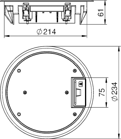Устанавливаемые вровень с полом круглые лючки GESR предусмотрены только для монтажа в помещениях с сухим типом уборки пола. Они устанавливаются в крышки монтажных оснований и кабельных каналов, а также в двойных и фальшполах. Мин. монтажная глубина составляет 70 или 75 мм. В комплект входит защитная рамка для напольного покрытия, рамка для установки монтажной коробки с растровой просечкой для ее постепенного заглубления с шагом в 5 мм (с возможностью заглубления максимум на 20 мм), и откидная крышка, закрепленная на защитной рамке. Откидная крышка защелкивается и захлопывается. В откидной крышке установлена прочная пластина из оцинкованнной стали толщиной 4 мм, поворотный кабельный вывод с прокладкой из пеноматериала и убирающейся внутрь ручкой. В выемку в откидной крышке можно вложить фрагмент напольного покрытия толщиной 5 или 10 мм. Ввиду ограниченного пространства для установки розеток рекомендуется использовать угловые штекеры. Высота штекера (без контактных штырей) может составлять от 27 до 47 мм. При высоте штекера 47 мм высота стяжки должна составлять не менее 80 мм.