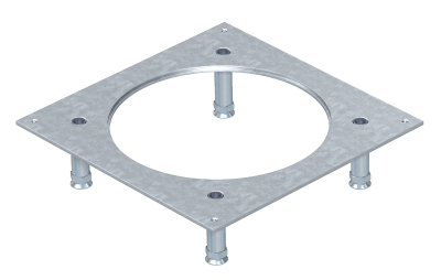 Усиленная крышка для монтажных оснований UZD250-3, с отверстием для монтажа усиленной кассетной рамки квадратной формы номинального размера R4. С четырьмя усиленными регулируемыми по высоте опорами, неподвижно закрепленными на монтажной крышке. Нивелировочные винты с контргайкой для фиксации отрегулированной высоты. Монтажное отверстие, заглубленное на 3 мм, для закрытия заглушкой.