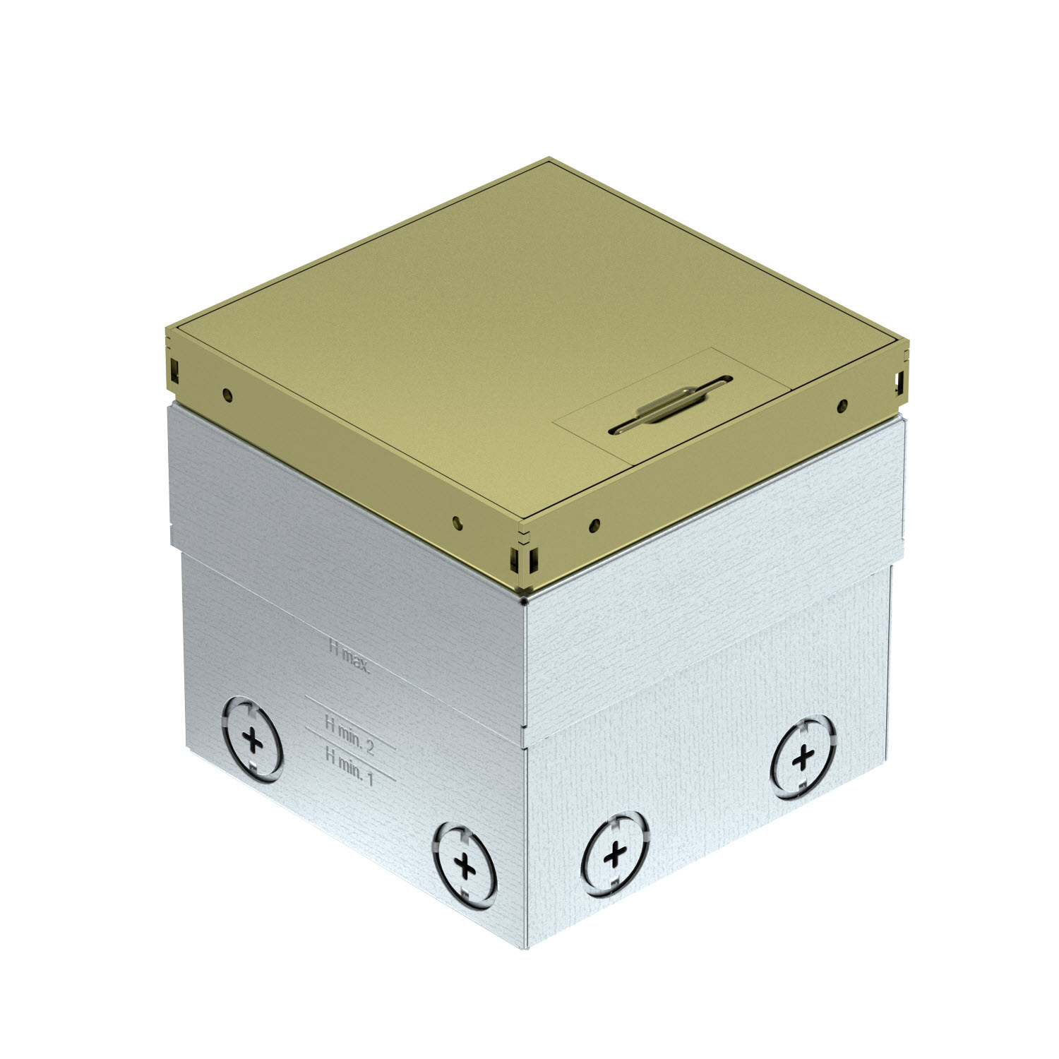 Квадратная напольная розетка для установки в пустотном полу и стяжке с сухим типом уборки. Встроенный корпус со штампованными отверстиями для ввода труб (M20/M25). Верхняя часть выравнивается по поверхности напольного покрытия с помощью 4-х регулируемых опор. Минимальная монтажная глубина составляет 100 мм,