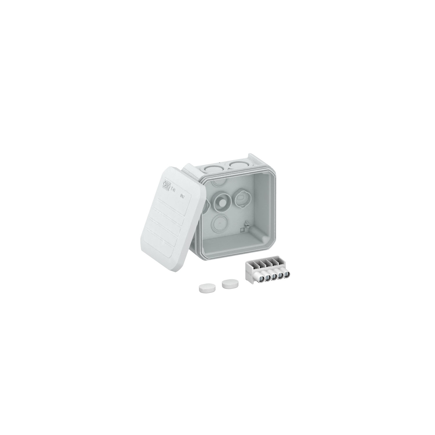 Кабельная распределительная коробка для соединения кабелей и проводов в помещении и в защищенных зонах вне помещения. Квадратная форма со штамповкой под отверстия по бокам и со штамповкой под отверстия в днище. Подходит для настенного и потолочного монтажа и установки на монтажных пластинах. С возможностью для внутреннего закрепления и монтажом поверх угловых колпаков. С несъемной крышкой для клемм. Изготовлено из устойчивых к УФ материалов, не содержащих галогены. Кабельная распределительная коробка согласно DIN EN 60670. Огнестойкость согласно DIN EN 60695-2-11, температура испытания 650 °C. Ударопрочность IK07 согласно DIN EN 50102.