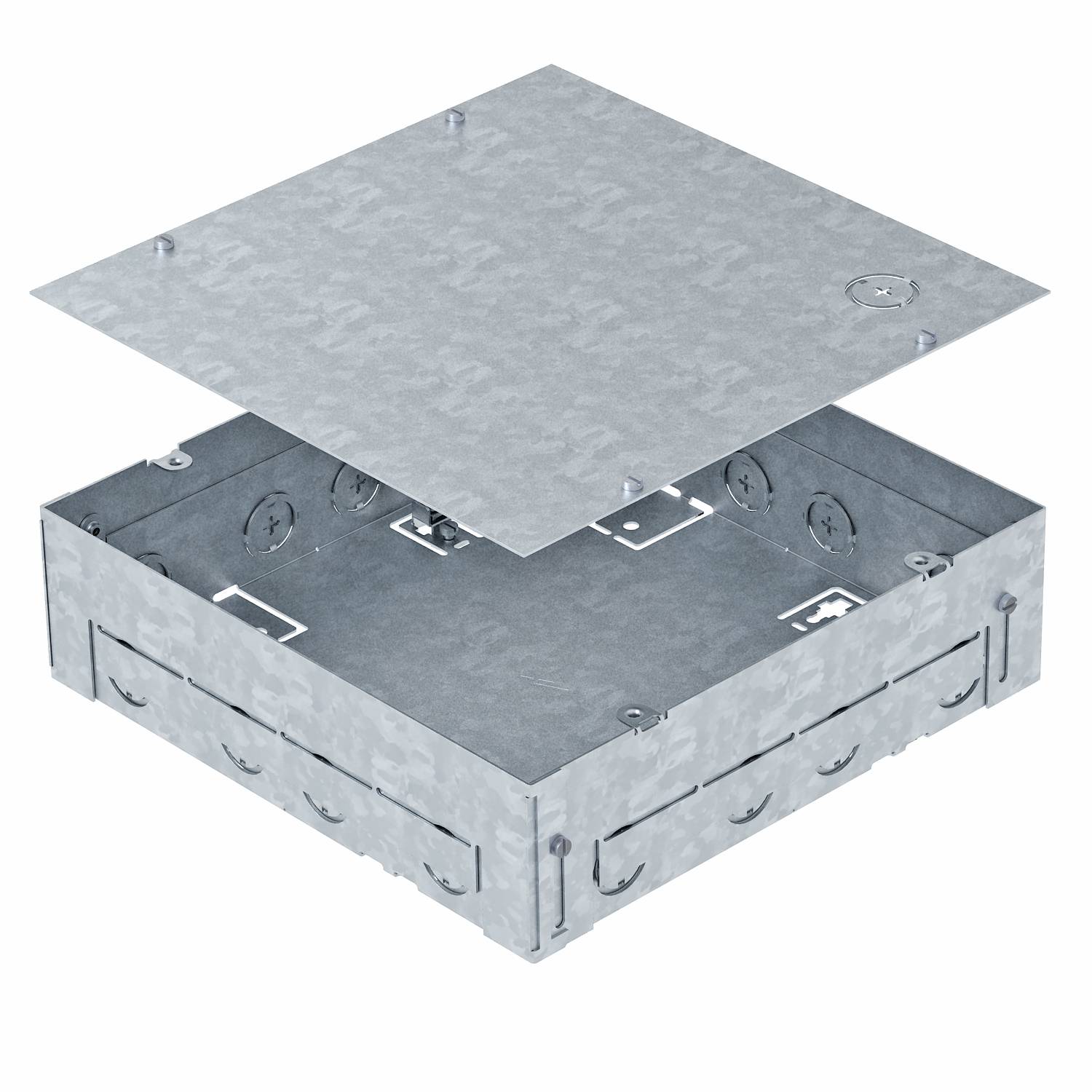 Квадратный встраиваемый корпус для лючка GES9-2 для применения в бесшовных полах во внутренних помещениях. С отверстиями для ввода кабеля (M25) со всех четырех сторон.