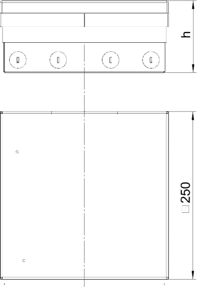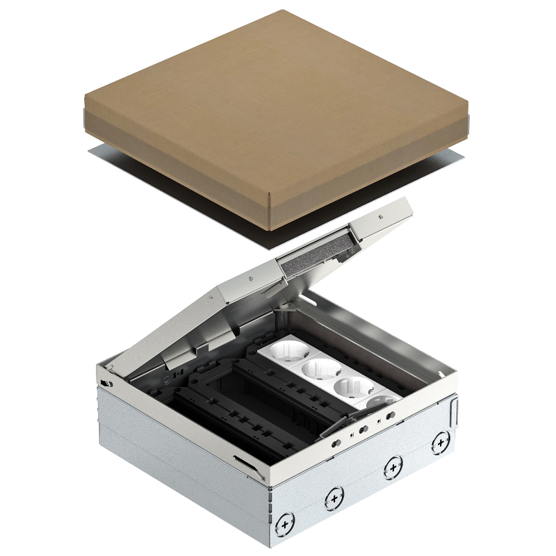 Квадратный лючок для установки в фальшполу и в стяжке с сухим типом уборки. Корпус со штампованными отверстиями для ввода труб (M25). Крышка выравнивается по поверхности напольного покрытия с помощью 4-х регулируемых по высоте опор. Минимальная монтажная глубина составляет 95 мм, диапазон регулирования по высоте + 30 мм. - 7427308